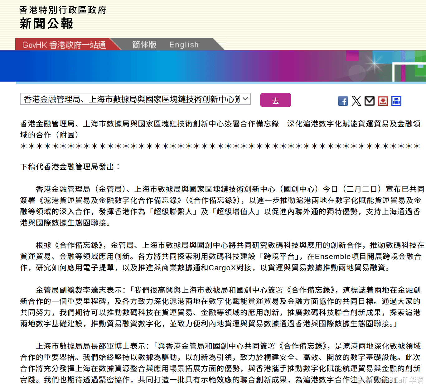 香港金管局、上海市数据局与国家区块链技术创新中心签署合作备忘录