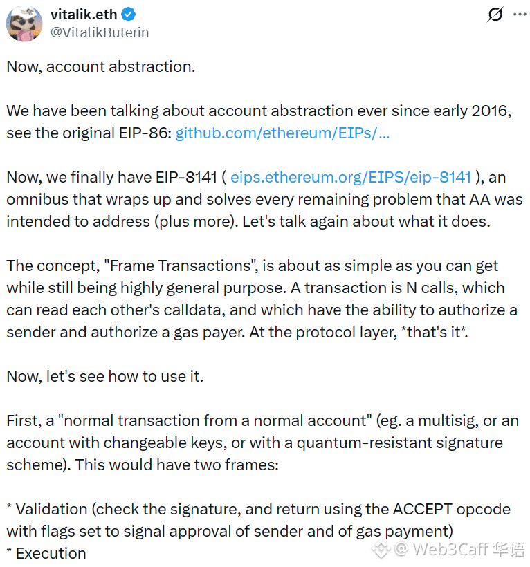 Vitalik:以太坊账户抽象协议 EIP-8141 将在 Hegota 升级后发布