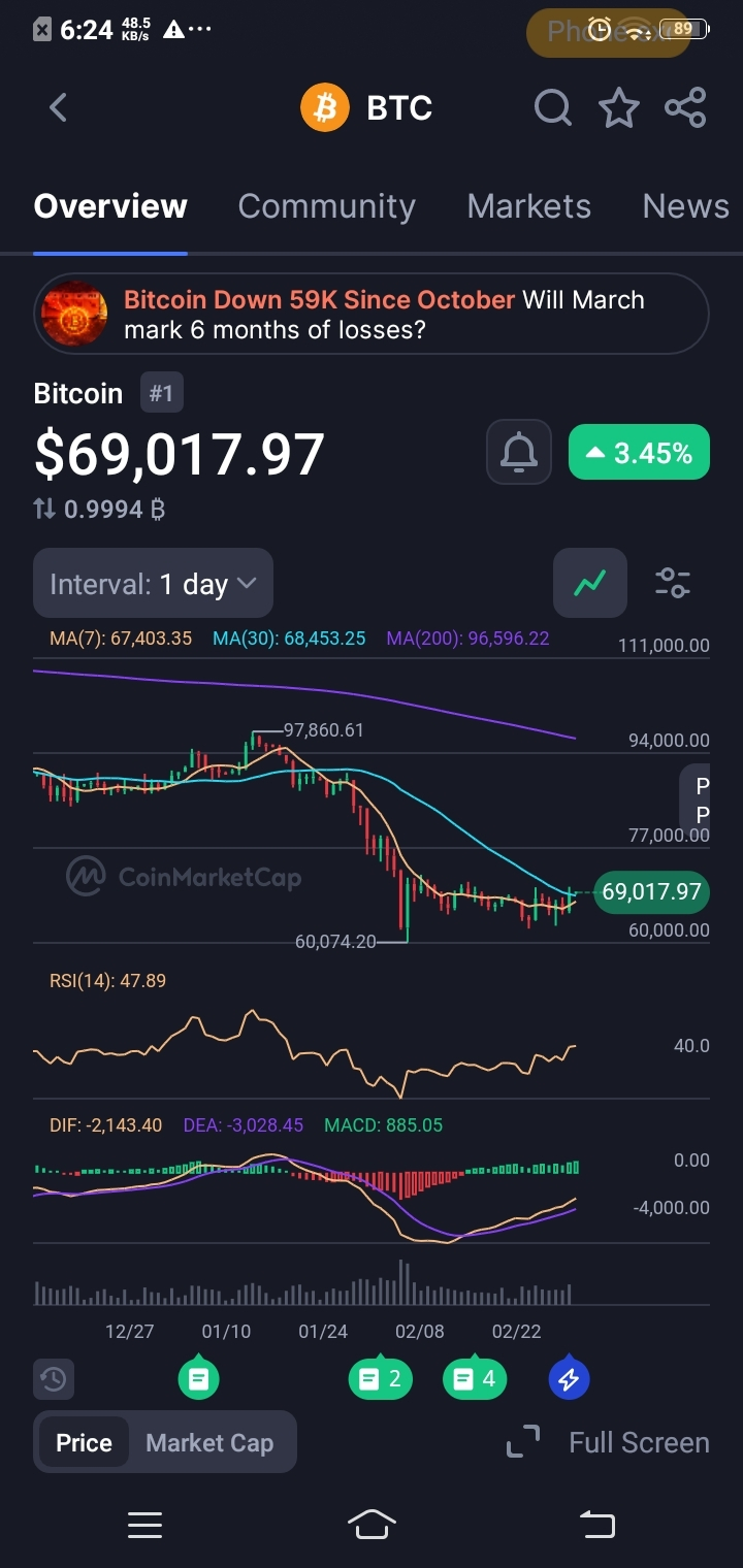 $BTC is currently trading near $69,000, but the landscape tells a story of compression. After the sharp drop from highs above $96K, price has been chopping sideways. The 7-day MA sits slightly below price, while the 30-day MA hovers just overhead at $68,453, creating a tight range. Crucially, the 200-day MA is far above at $96,596, confirming we are still technically in a long-term downtrend correction.
