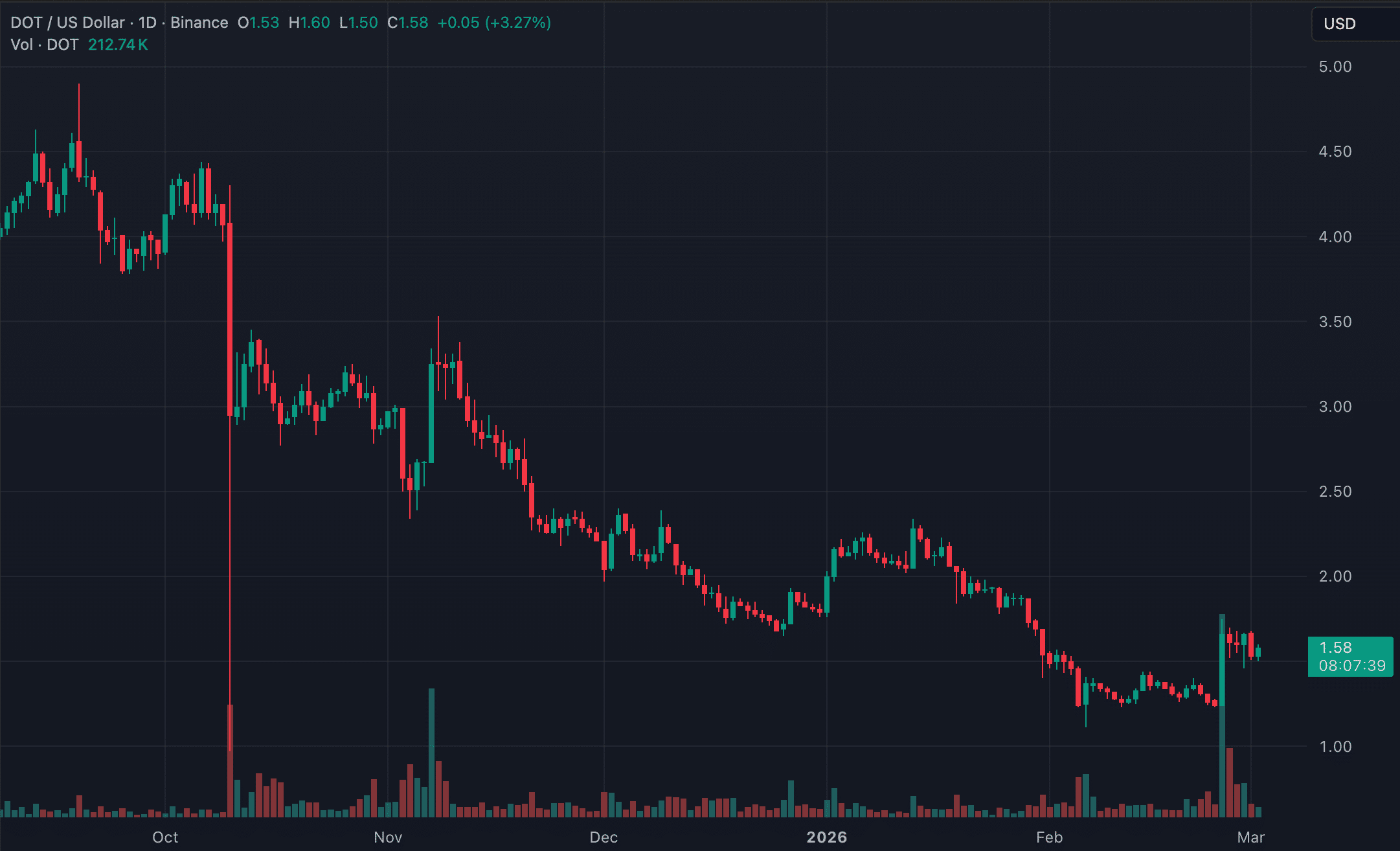 DOT đang giảm 60% và giao dịch quanh mốc $1.55 khi mạng lưới đề xuất đợt tái thiết lập tokenomics khổng lồ để cắt giảm lạm phát. Bạn đang gom hàng ở mức đáy chu kỳ này để đón đầu sự đảo chiều cơ bản dài hạn, hay kiên nhẫn chờ một cú bứt phá kỹ thuật xác nhận qua bức tường kháng cự $2.00 trước khi mạo hiểm rủi ro vốn?