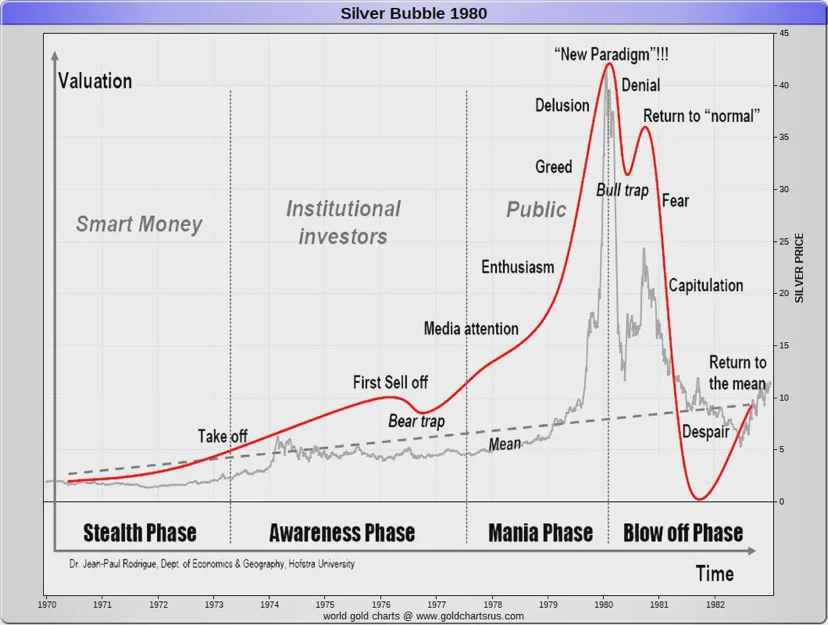 Looking back at history for a reality check: those massive spikes in 1980 and 2011 ended up with brutal multi-year drops of 40-70%. The recent 37% plunge in silver over just a week or so fits right into those old patterns, but past cycles often took months or even years to find a real floor.