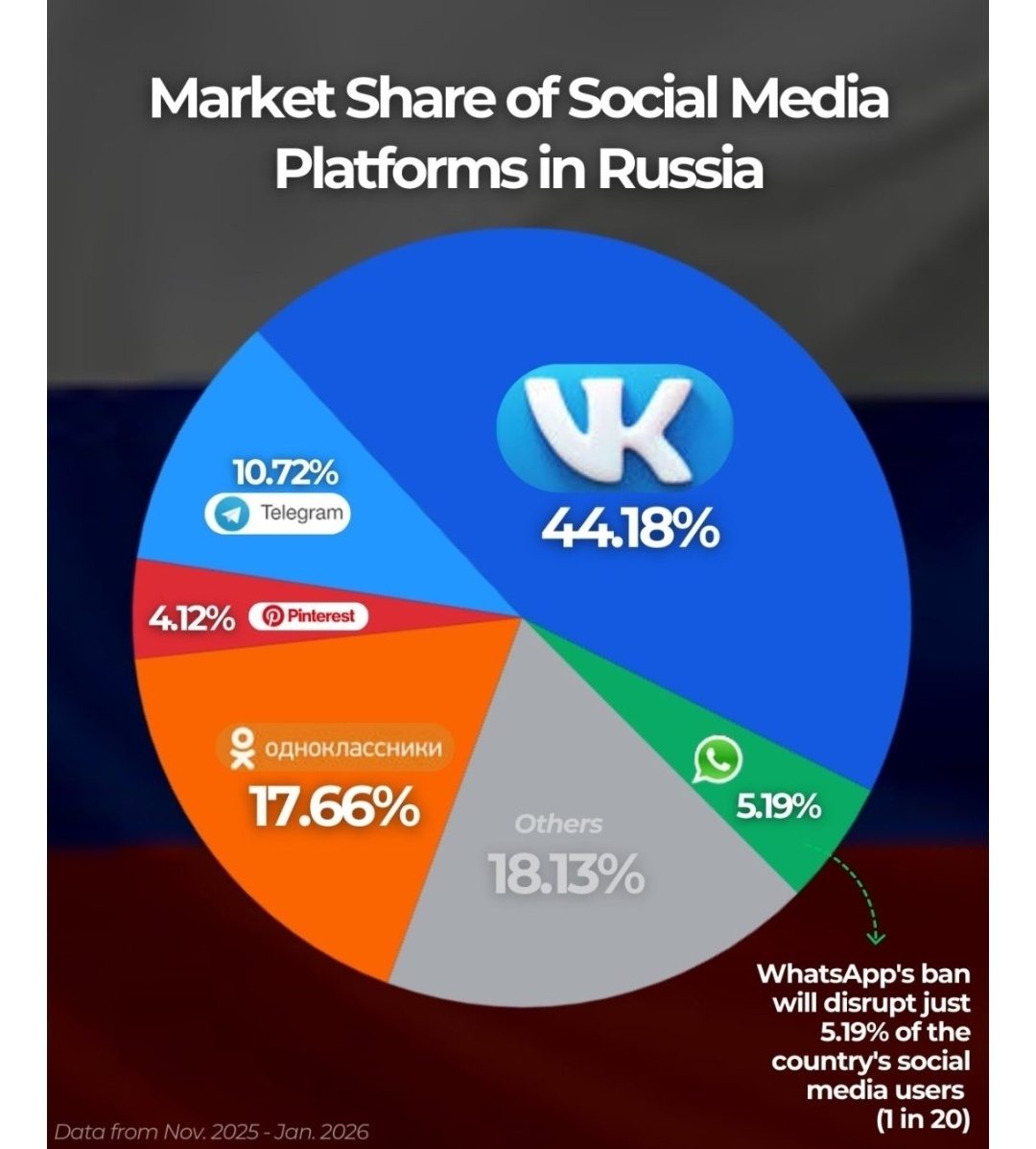 Surprisingly, WhatsApp’s ban in Russia will disrupt just 5.19% of the country’s social media users.