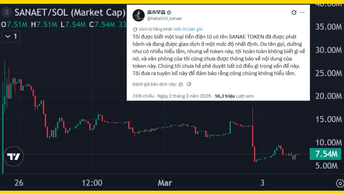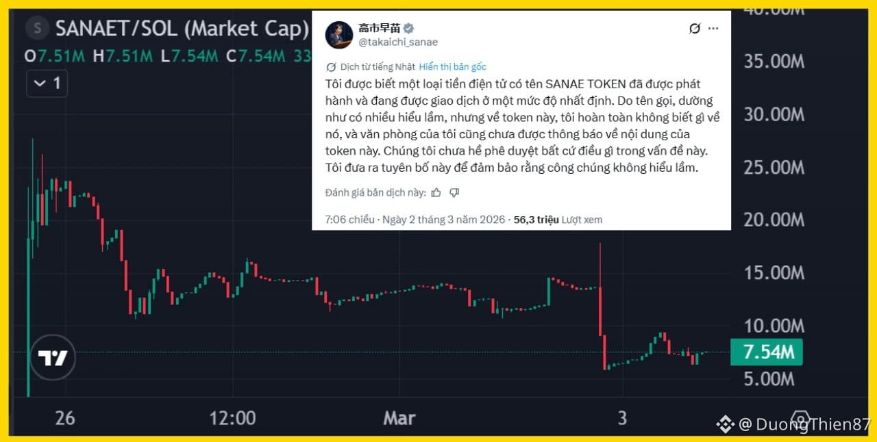 "SANAE TOKEN" bất ngờ xuất hiện trên Solana, bay mạnh đưa vốn hoá lên $28M rồi sập dần về còn $7,5M. Cái tên này buộc thủ tướng Nhật 🇯🇵 Sanae Takaichi phải lên tiếng thanh minh: