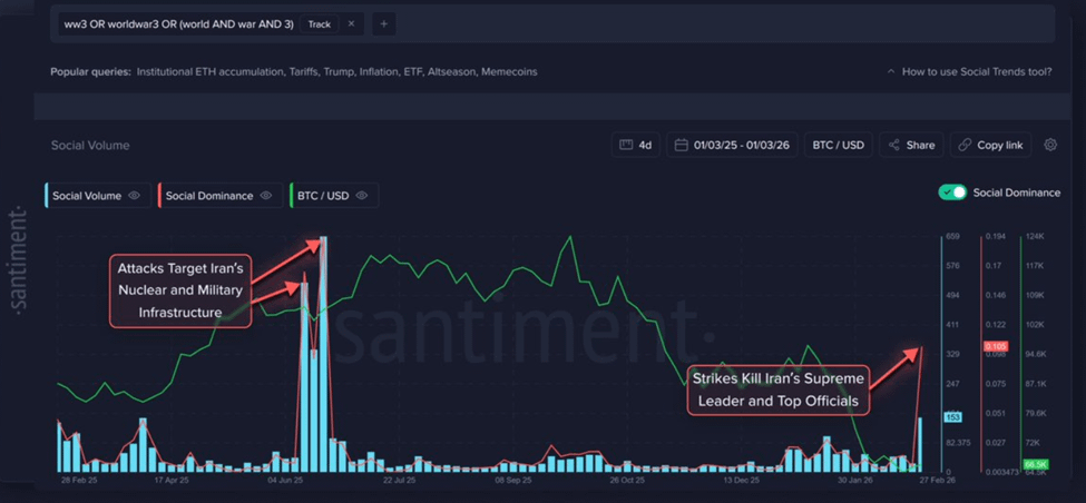 Аналитическая компания Santiment зафиксировала резкий всплеск упоминаний термина «Третья мировая война» в социальных сетях. Данный показатель обновил локальный максимум, установленный летом 2025 года. Подобная реакция вызвана серией ударов по территории Ирана, что заставило участников рынка готовиться к негативным сценариям развития событий.