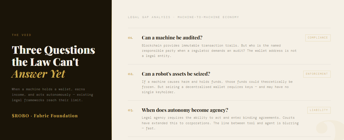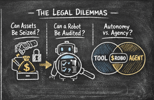 Jeśli robot trzyma fundusze i wykonuje transakcje, regulator w końcu będzie chciał ślad. Blockchain to zapewnia — transakcje są niezmienne. Ale kto je interpretuje? Kto jest odpowiedzialną stroną wymienioną w audycie? "Adres portfela" nie jest podmiotem prawnym.