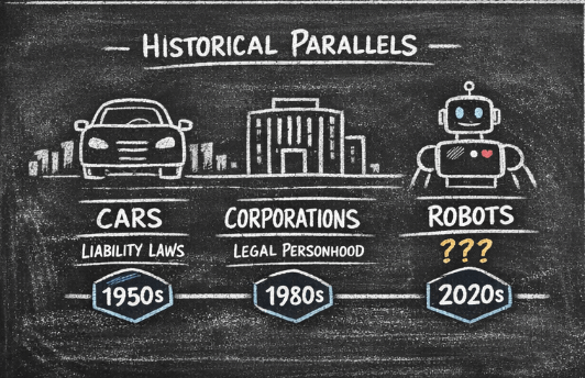 Gdy samochody stały się powszechne, potrzebowaliśmy dziesięcioleci, aby uporządkować ramy odpowiedzialności. Kto jest odpowiedzialny w przypadku wypadku — kierowca, producent, władze drogowe? Zbudowaliśmy systemy ubezpieczeń. Napisaliśmy prawo drogowe. Stworzyliśmy prawną fikcję „rozsądnego kierowcy”.