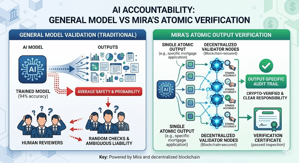 The core problem of modern AI is that outputs are often treated as suggestions rather than legally binding decisions; this creates a "gray zone" where organizations reap the benefits of machine speed while evading liability when things go wrong. A credit model may be correct ninety-four percent of the time, but the remaining six percent of errors represent a catastrophe for those unfairly denied a loan. Mira addresses this by establishing a verification infrastructure where every AI output must undergo a rigorous auditing process before execution. This process is akin to a manufacturer labeling each specific product as "passed inspection" rather than just claiming their general production line meets standards; it creates a transparent audit trail—the very thing regulators and courts demand in sensitive industries like insurance or banking.