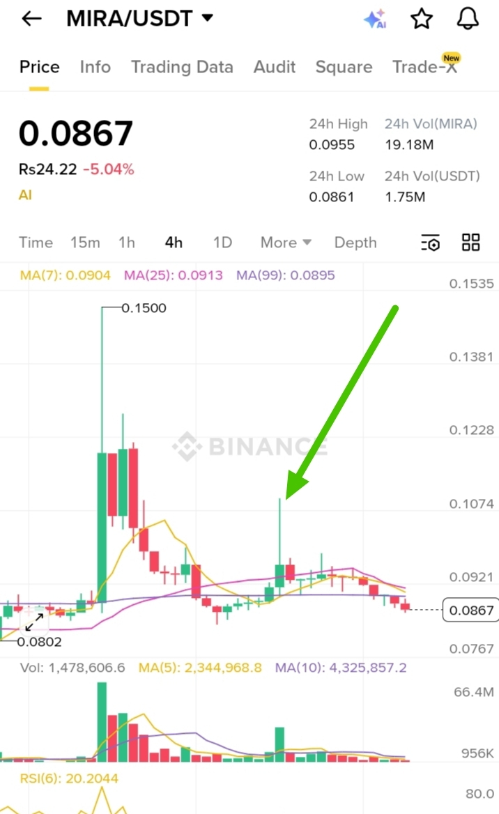 Right now on the chart (Binance MIRA/USDT), price is chilling at $0.0867, down about 5% in the last 24h after touching a high of $0.0955. Low was $0.0861, and volume's solid – 19M MIRA traded (~$1.75M USDT side), showing decent liquidity for this narrative.