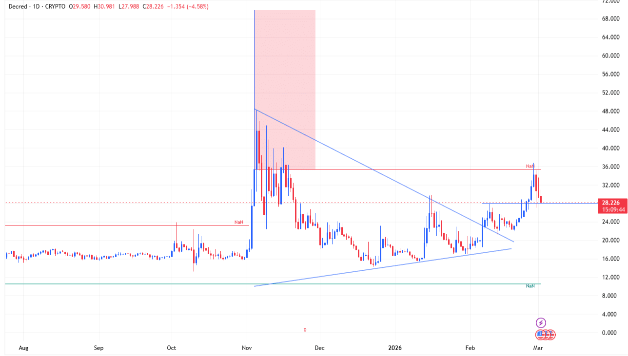 Thị trường đang khóa chặt trong một trận chiến khốc liệt. Tuy nhiên, với việc phe mua altcoin đang giành lại thế thượng phong nhờ sự suy yếu trực tiếp của áp lực bán, hành động giá của DCR có khả năng đảo chiều trở lại một nhịp chạy đà tăng giá cao hơn. Nếu vùng $28 được chuyển hóa thành công thành động lượng tăng bền vững, một nhịp nảy nhanh chóng trở lại vùng cung $34.40 hoàn toàn có thể xảy ra.