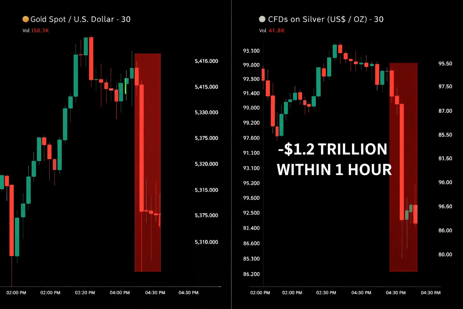 Geopolitical tensions are rising, yet precious metals are not reacting the way many expected. Instead of a sustained rally, both gold and silver saw sharp reversals — wiping out nearly $1.2 trillion in market value within an hour.