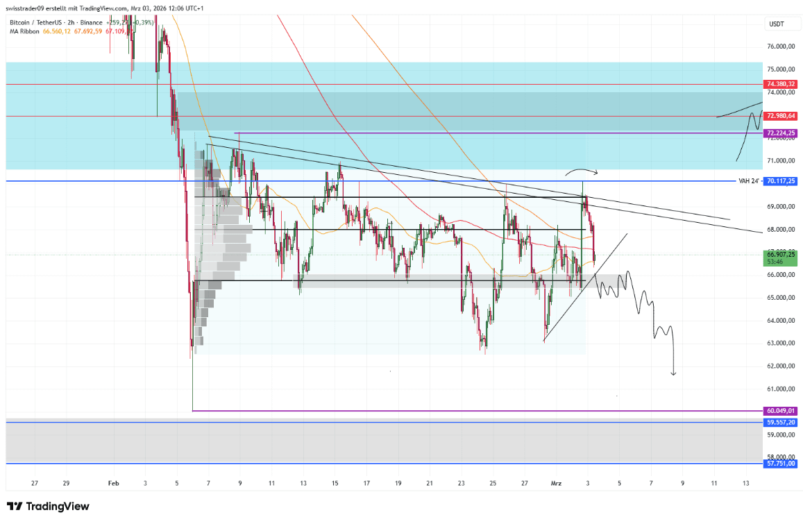 Price oscillating between upper resistance and crucial support near $66,000 — the market is balanced on a knife's edge.