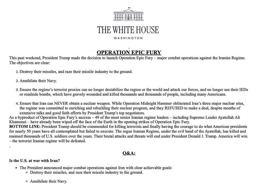Biały Dom opublikował szczegółowy zarys tego, co nazywa „Operacją Epic Fury”, opisując to nie jako formalne ogłoszenie wojny, ale jako „ważną operację bojową” wymierzoną w Iran.