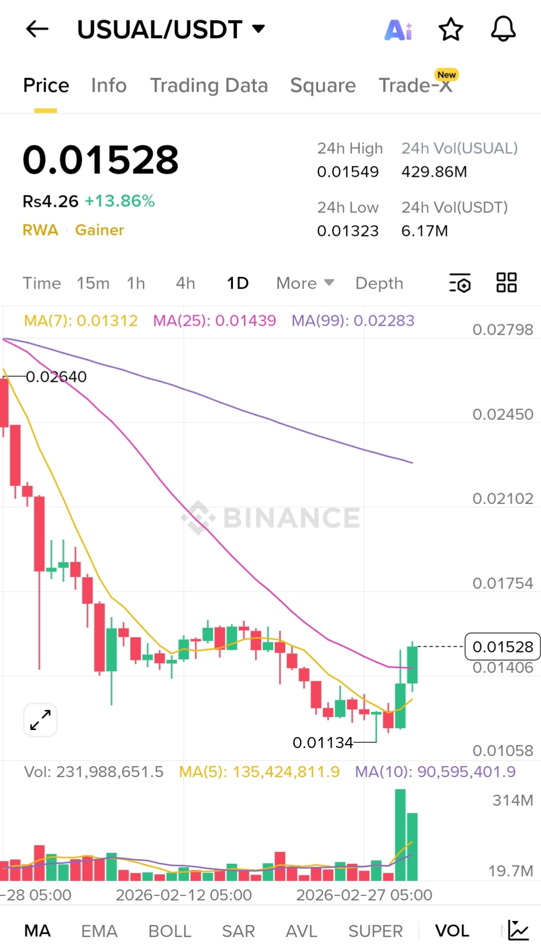 USUAL has been in a steady downtrend for weeks but recently formed a local bottom around 0.0113. Price is now pushing above the short-term moving averages with increasing volume.