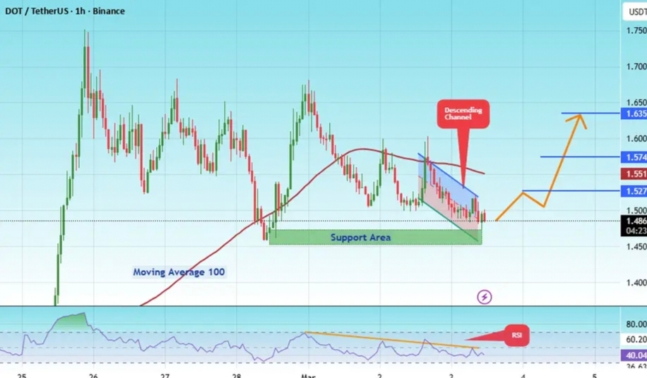 Istnieje kluczowa strefa wsparcia w zielonym kolorze na poziomie 1.46, a cena odbiła się od tej strefy kilka razy, co czyni ją silnym poziomem wsparcia.