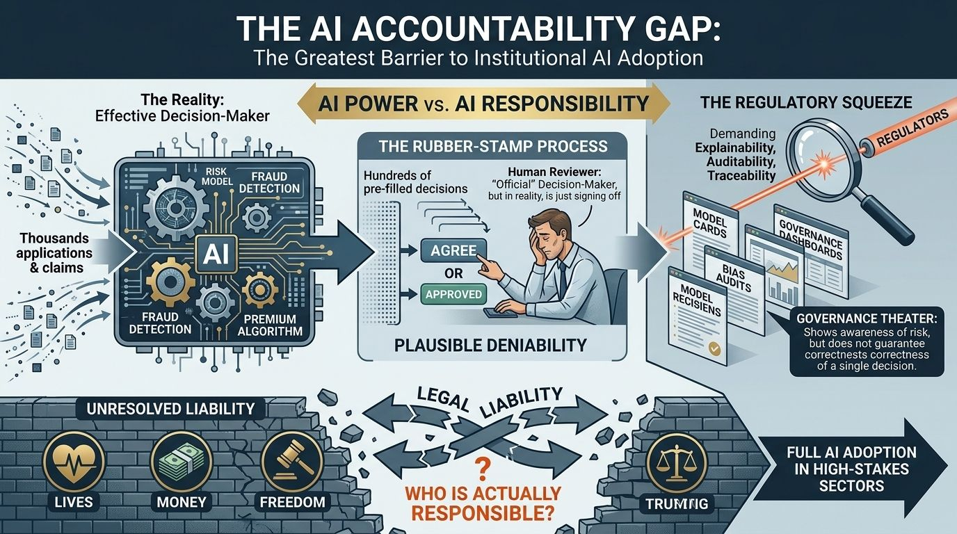 The AI industry has long avoided a critical question: when an AI system causes real-world harm, who is actually responsible? This isn’t theoretical—it’s about careers being ended, investigations launched, or multi-million-dollar settlements. Right now, there’s no clear answer, and that uncertainty is the biggest barrier to AI being fully adopted in institutions. The problem isn’t cost, model quality, or integration complexity—it’s lack of accountability.