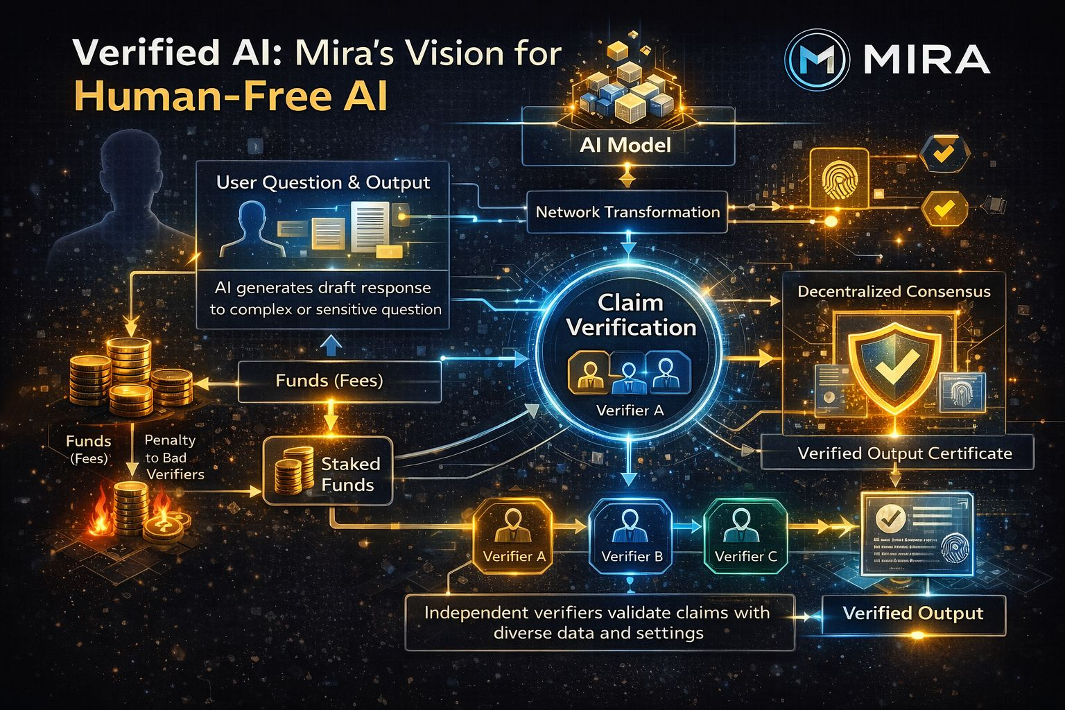 MIRA frames a path toward human-free AI by treating verification as a first-class network function rather than a downstream manual process. The main idea is to transform an output into a set of independently checkable claims and then have multiple independent verifiers converge on those claims through decentralized consensus. Instead of trusting a single model’s internal confidence, trust is shifted to a collective decision that is costly to fake and cheap to audit after the fact. “Human-free” here doesn’t mean removing humans from the system’s values; it means reducing the need for humans to supervise each individual answer in real time.