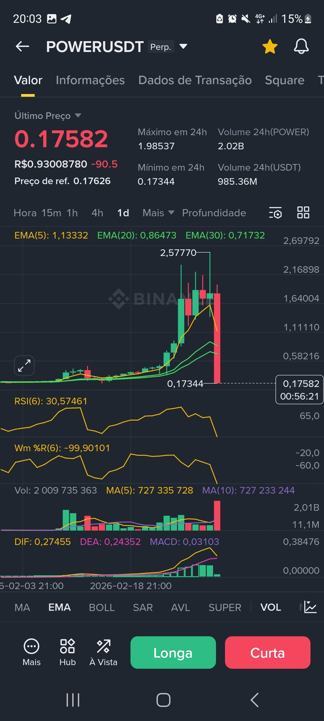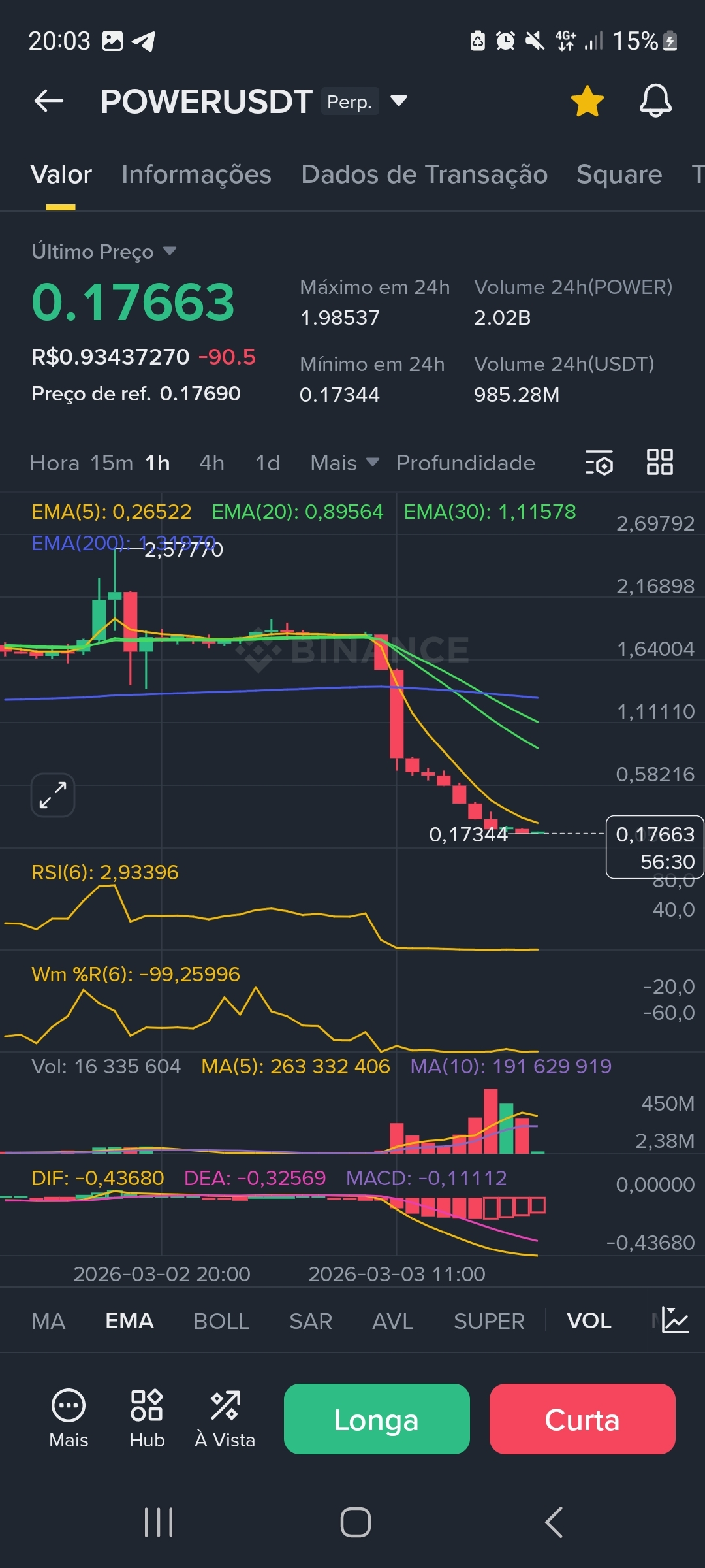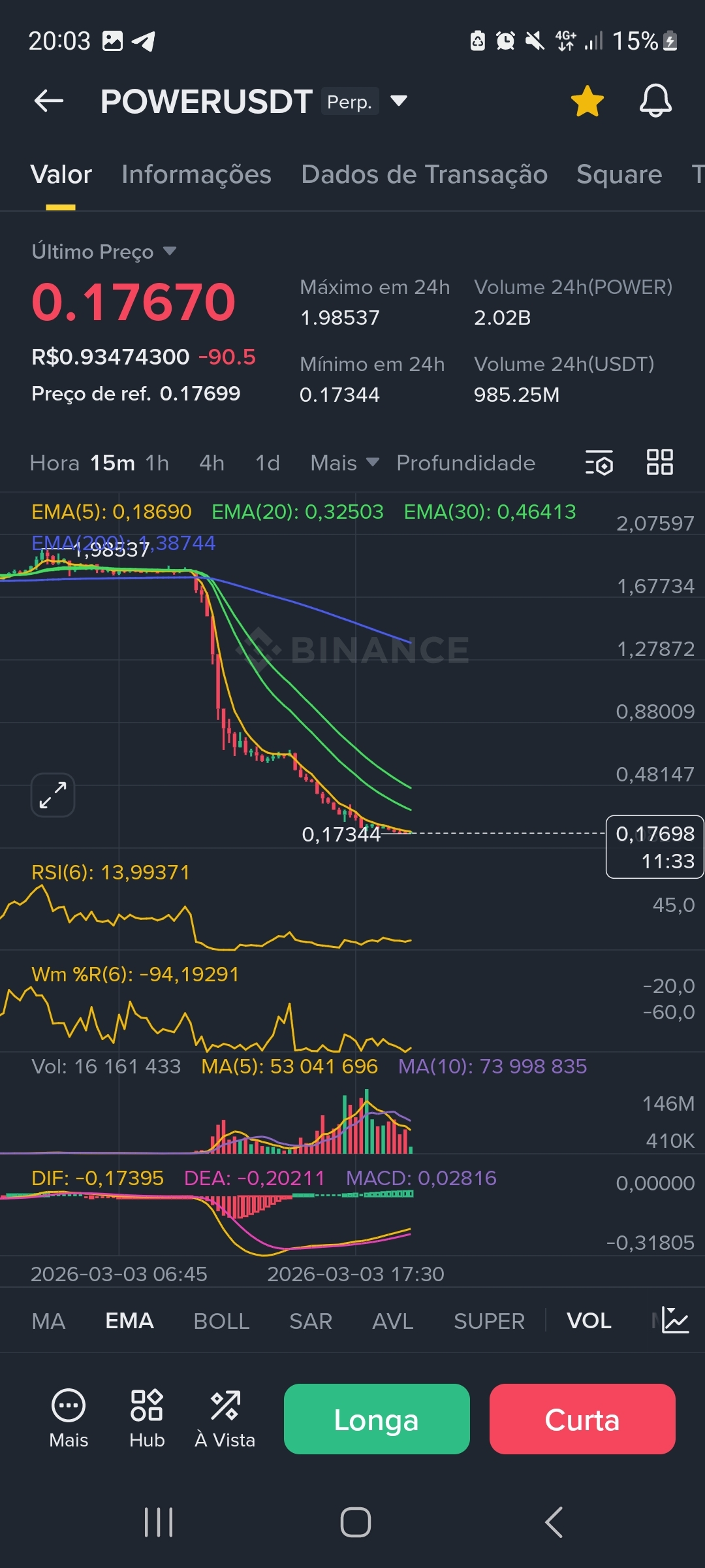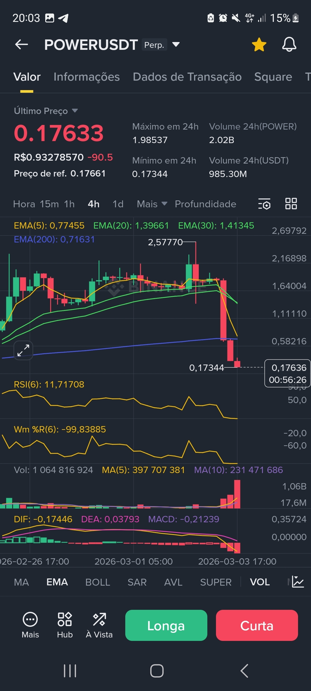* Wskaźniki wyczerpania: Na wykresie 1H, RSI(6) znajduje się na ekstremalnych poziomach wyprzedaży (2,93), a na 15M wynosi 13,99. Wm %R również sygnalizuje ekstremalną wyprzedaż na poziomie -99,8.