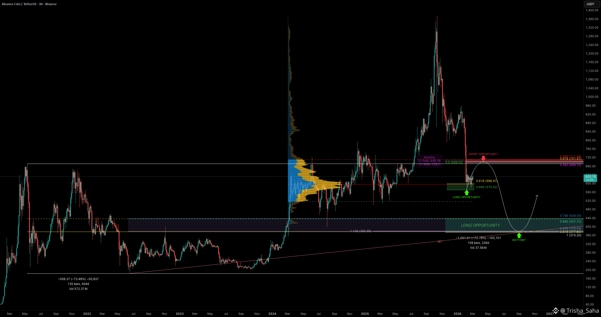 After the aggressive sell-off at the start of the year, BNB found temporary support around the $600 range, where price has been consolidating for roughly a month. This zone aligns with the Golden Pocket of the entire bull market cycle.