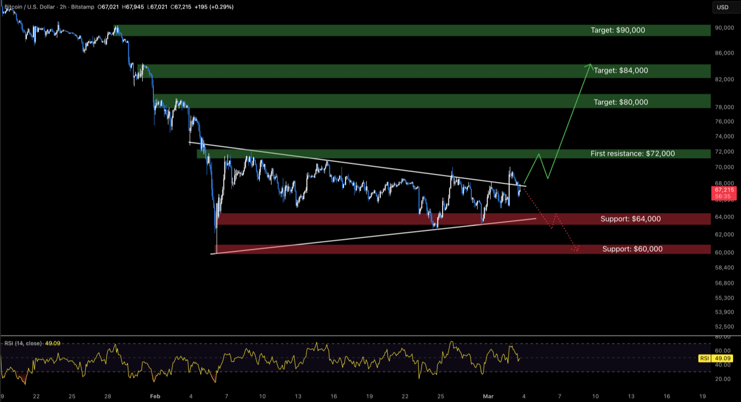 Mọi sự chú ý giờ đây dồn về mức hỗ trợ $64.000. Một cú bứt phá xịt kết hợp với việc mất hỗ trợ là một combo giảm giá cực kỳ tàn khốc. Nếu mốc $64.000 bị bẻ gãy, cấu trúc sẽ chính thức chuyển sang giảm giá, và một cú sập nhanh chóng về $60.000 sẽ ngay lập tức xảy ra.