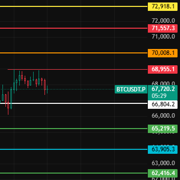 Duża moneta dzisiaj zwraca uwagę na 66800 to miejsce, jeśli tylko nie złamie tego miejsca, to poziom dzienny nadal będzie wskazywał na odbicie, mniejsze korekty również będą odbijać się w górę, zwróć uwagę na opory w pobliżu 68955-70000-71560!