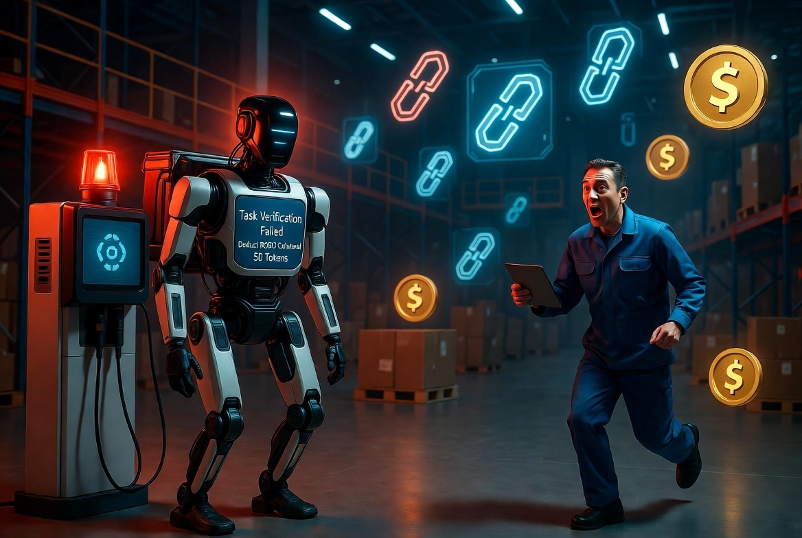 一台刚送完最后一单的送货机器人停在充电桩前一动不动,屏幕上跳出一行冰冷的链上记录:“任务验证失败,扣除保证金ROBO 50枚。”