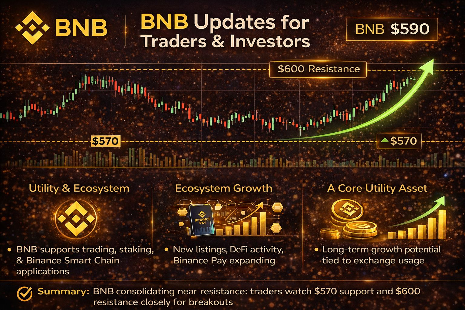 $BNB remains one of the most actively traded exchange tokens, supported by strong utility within the Binance ecosystem — including reduced trading fees, staking, and use in Binance Smart Chain (BSC) applications. Recently, BNB has shown steady price consolidation with relatively strong support around key levels, as traders monitor whether buyers will push above resistance to continue an uptrend. Binance’s ongoing ecosystem growth — through new listings, #DEFI activity, and Binance Pay adoption — helps maintain demand for BNB, while regulatory clarity and market sentiment continue to influence short-term price moves. Analysts view BNB as a core utility asset with long-term growth potential tied to exchange usage and blockchain expansion, but traders still watch volatility and support/resistance levels to identify entries and exits.