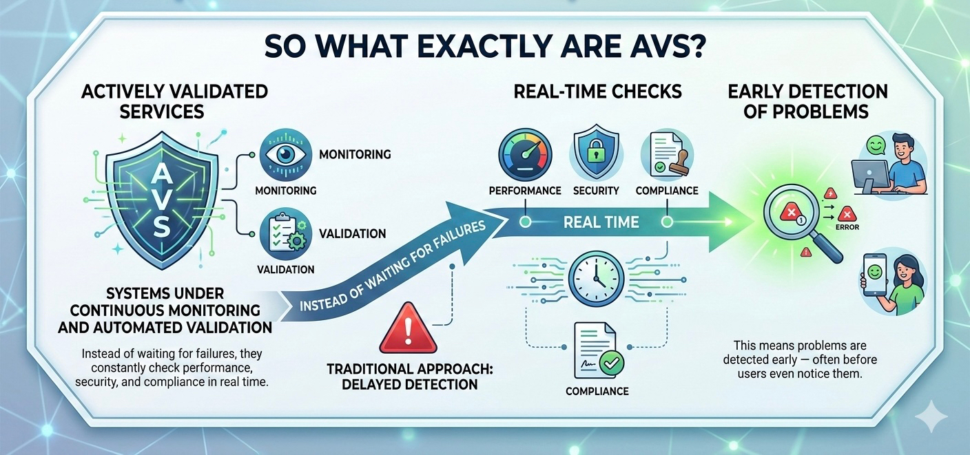 Actively Validated Services are systems that operate under continuous monitoring and automated validation. Instead of waiting for failures, they constantly check performance, security, and compliance in real time.