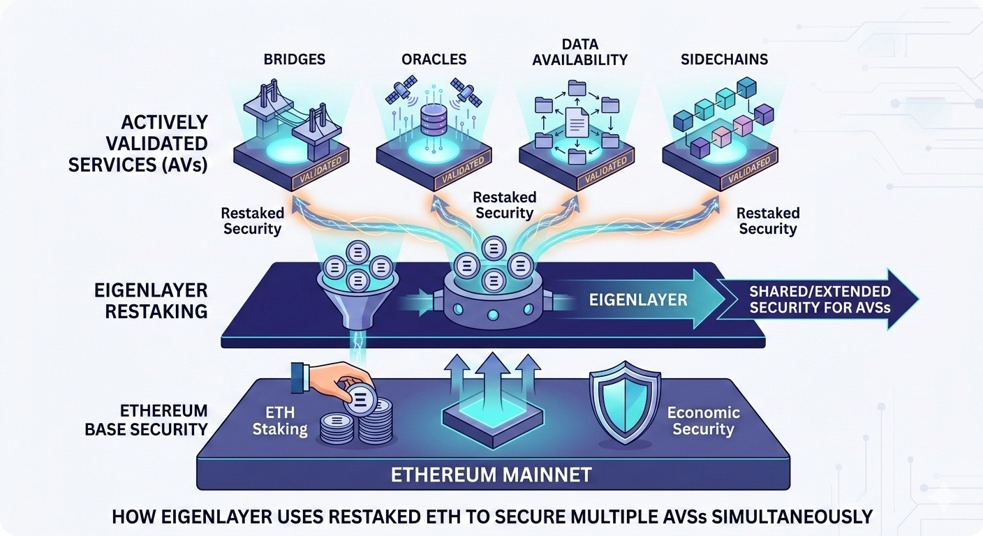 Built on Ethereum, EigenLayer allows users to restake ETH to secure multiple protocols simultaneously. Validators donât just validate one network â they actively secure additional services, expanding Ethereumâs economic security.