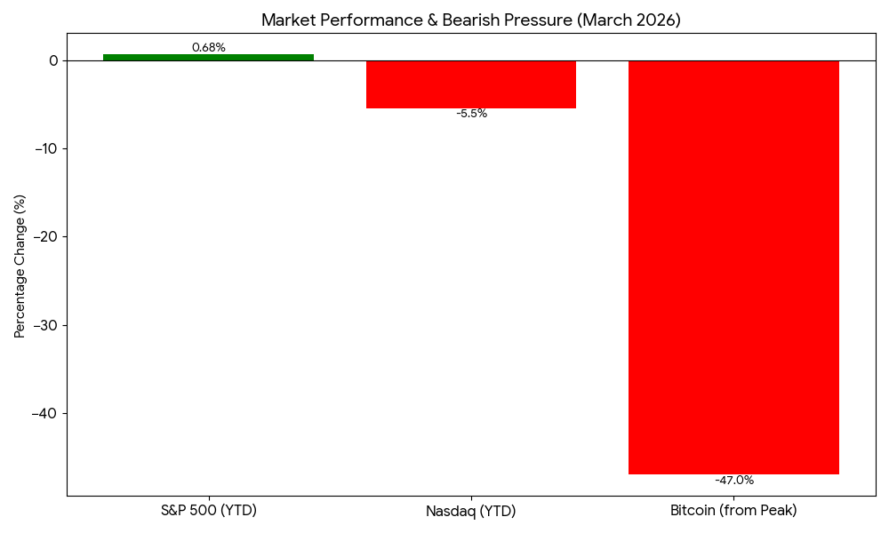 Based on the facts and figures provided for the current market state as of March 4, 2026, I have generated a chart visualizing the bearish pressure and the divergence between key indices and Bitcoin.