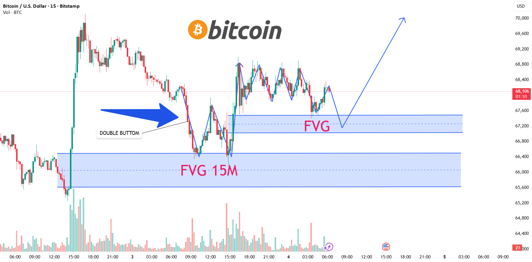 Bitcoin zbliża się obecnie do strefy Fair Value Gap (FVG) wokół 67,200. Obszar ten może działać jako potencjalny punkt reakcji, jeśli cena pokaże potwierdzenie, a kupujący powrócą na rynek.