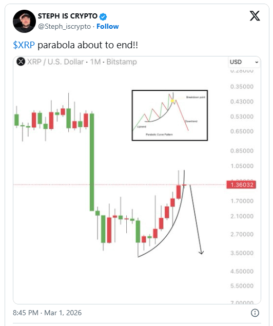 Gdy parabola się kończy, może nastąpić natychmiastowa sekwencja wzrostowa. Połączenie struktury wykresu, wcześniejszego zachowania cen i prognoz analityków stawia XRP w pozycji do potencjalnego znaczącego wzrostu w marcu.