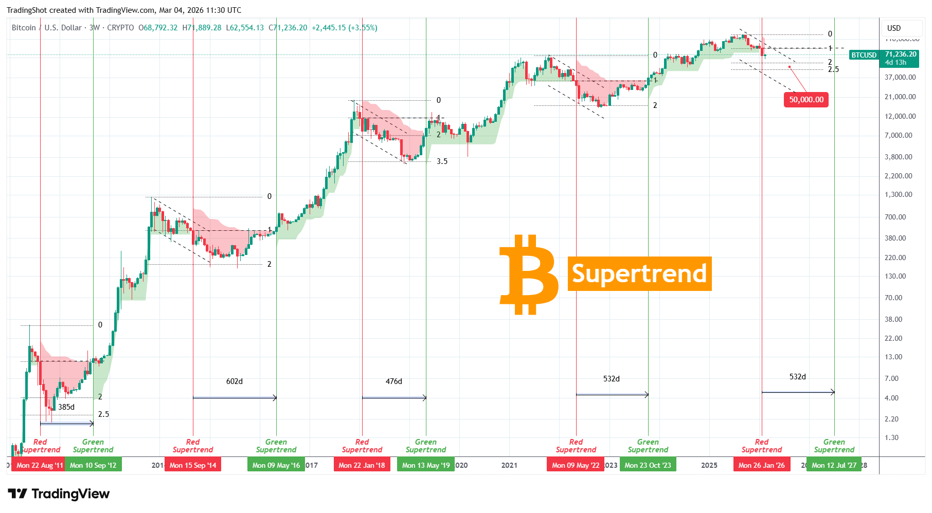Bitcoin (BTCUSD) właśnie przeszedł na czerwono w swoim wskaźniku Supertrend na interwale 3W i to może być naprawdę odkrywcze dla reszty cyklu niedźwiedzia.