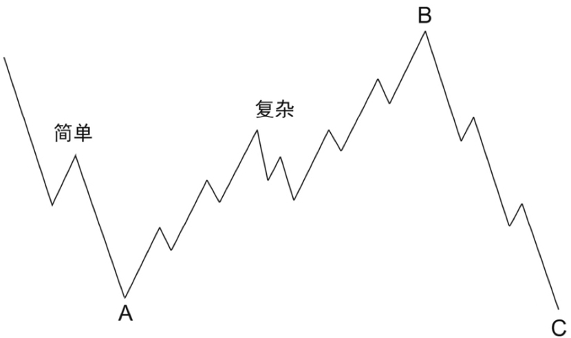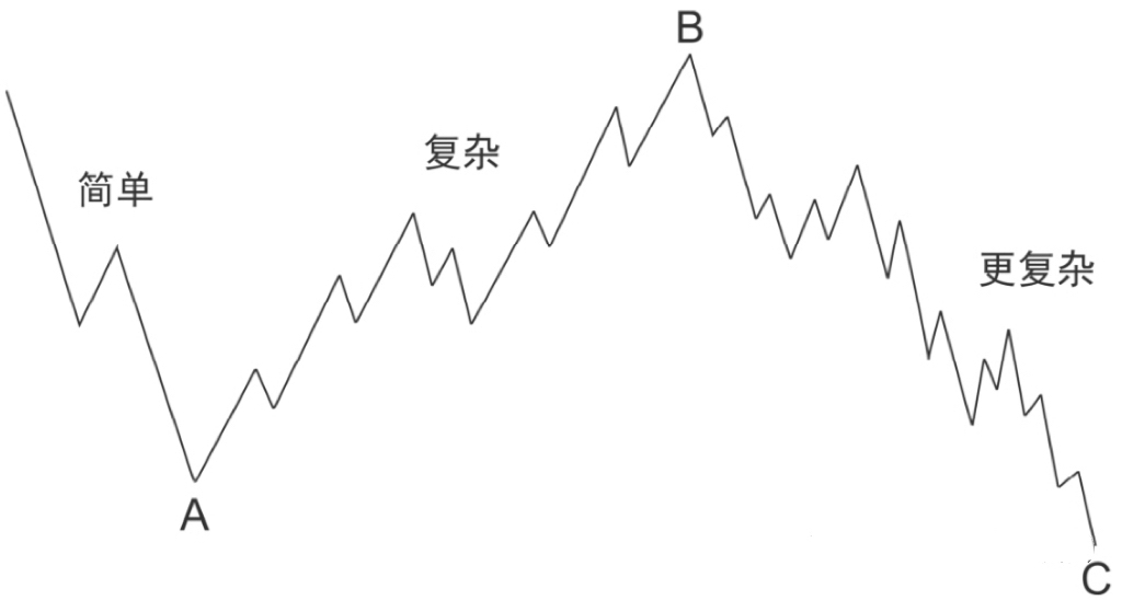 在一轮大调整中:若以简单的 a-b-c 锯齿形浪A开启 → 浪B往往会展开为子浪更复杂的 a-b-c 锯齿形调整浪,以实现类型交替。有时浪C还会进一步复杂化。复杂性相反的顺序(先复杂后简单)较为少见。