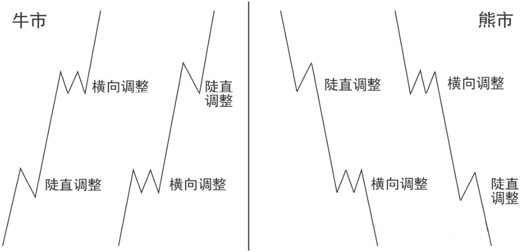 陡直调整:多为各种锯齿形(单锯齿形、双重锯齿形或三重锯齿形),有时以锯齿形开始的双重三浪。它不包含新的极端价格,即不会超越前一个推动浪的正统终点。