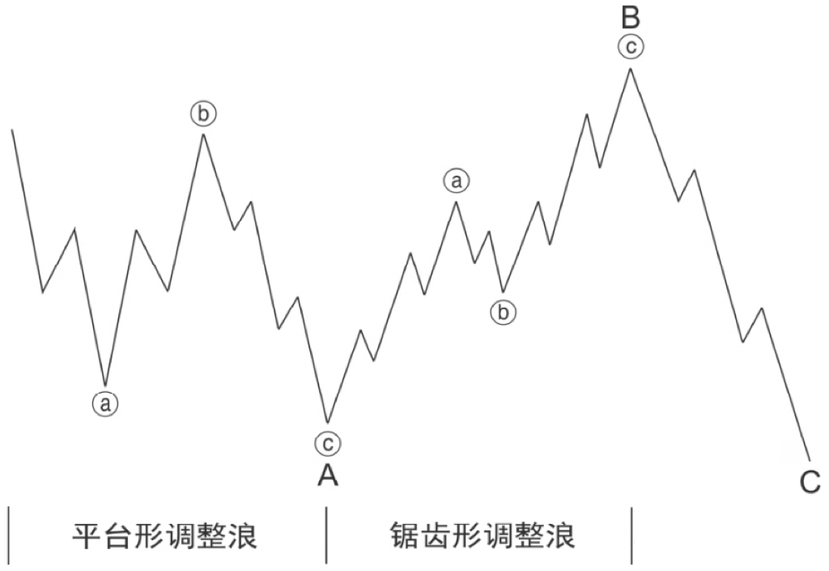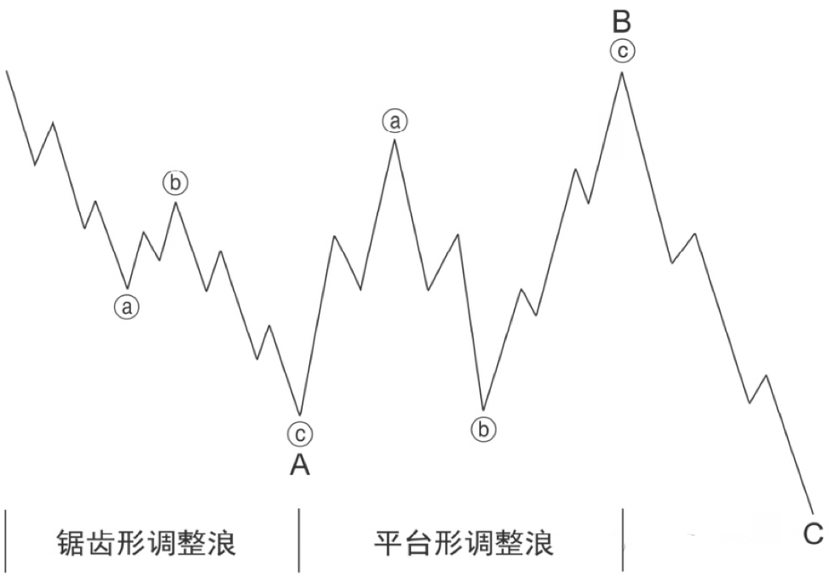 如果调整以平台形 a-b-c 结构的浪A开始,那么浪B通常是锯齿形 a-b-c 结构,反之亦然。