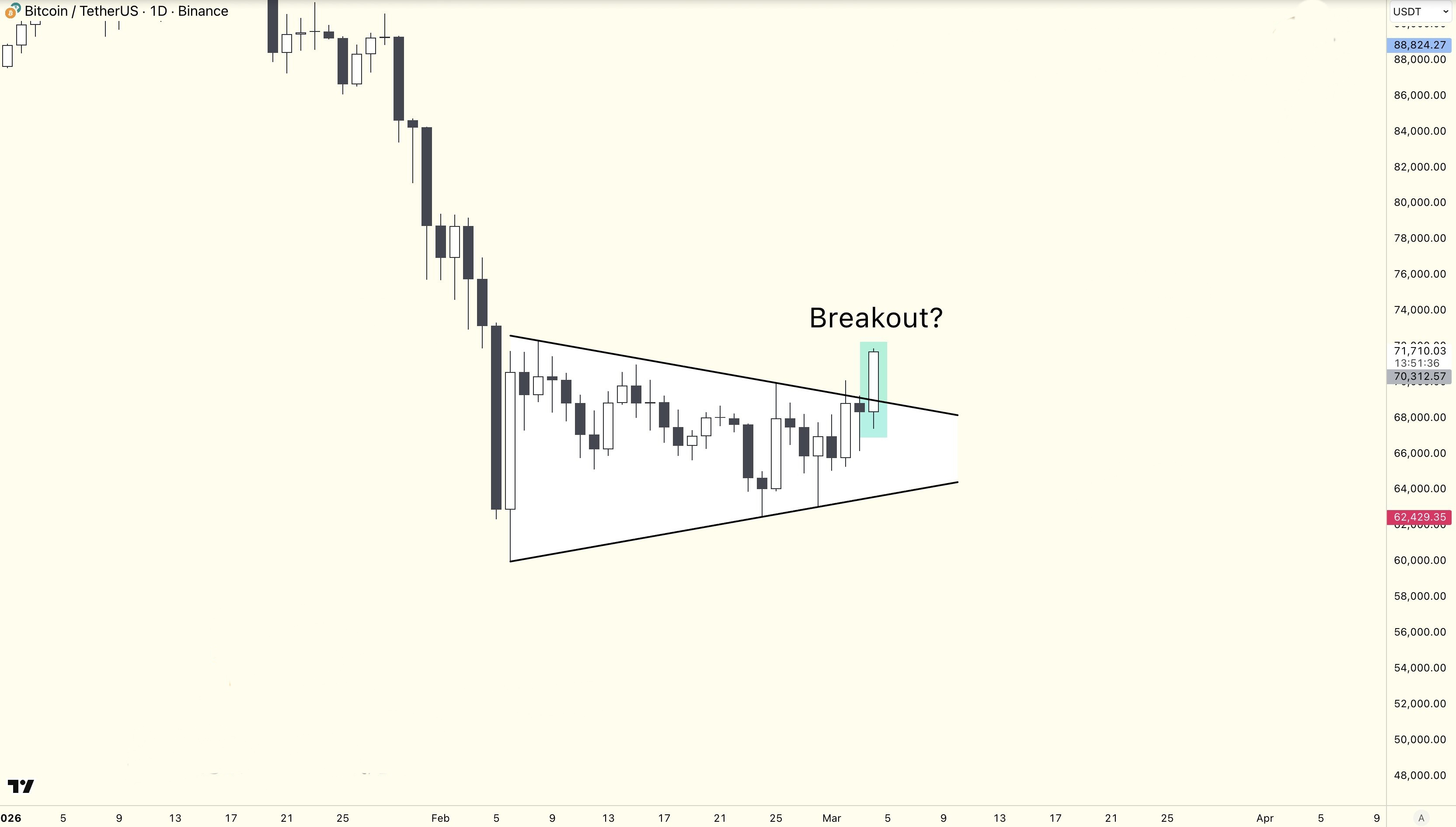 Chwila przełomu: mocna zielona świeca (określona kwadratem na zdjęciu) przekroczyła górny bok trójkąta przy poziomie około 70 312 USD. Ten przełom zwykle poprzedzany jest gwałtownym ruchem cenowym w kierunku złamania.