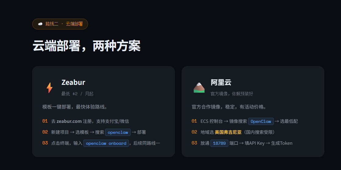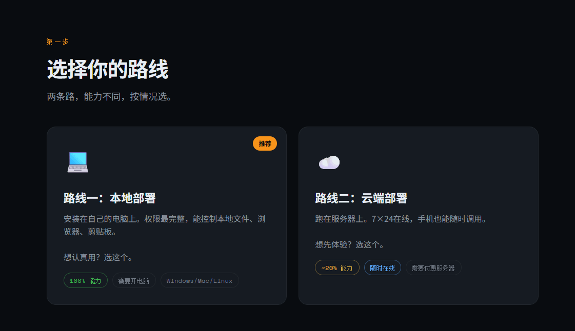 云端部署——装在服务器上,7×24在线,手机也能随时调用。适合不想开着电脑的人。
