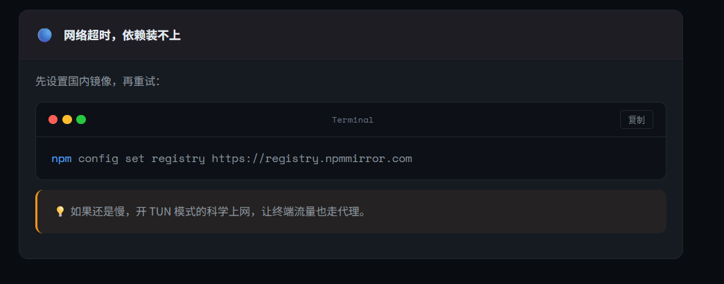 没装Node?去 nodejs.org 下载LTS版本,装完重新打开终端。