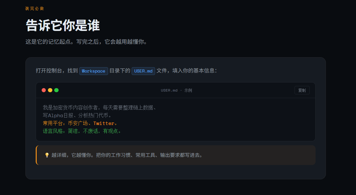 这是你告诉小龙虾"你是谁"的地方。