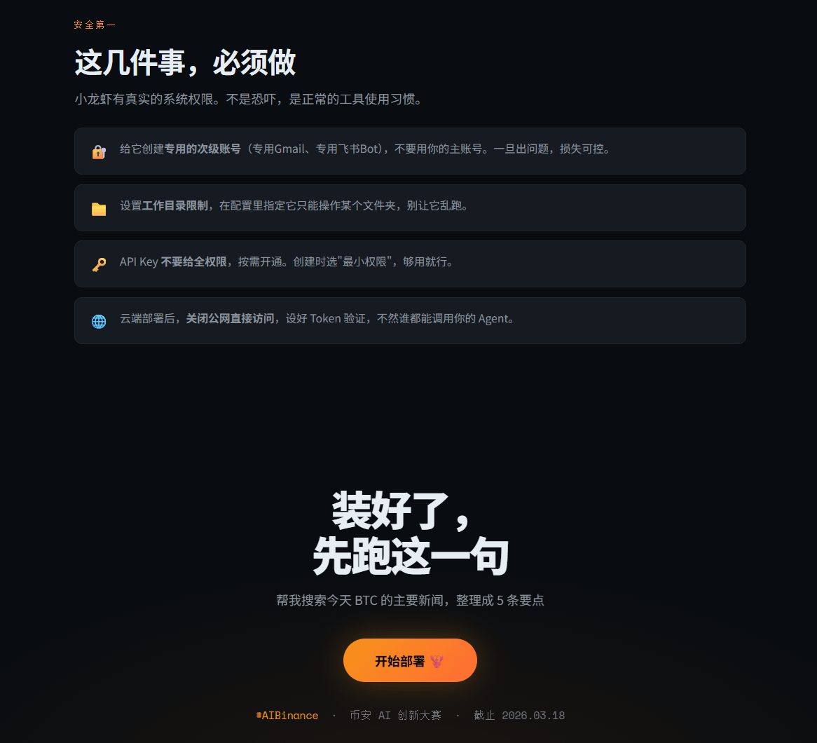 给它创建专用的次级账号(专用Gmail、专用飞书Bot),不要用主账号
