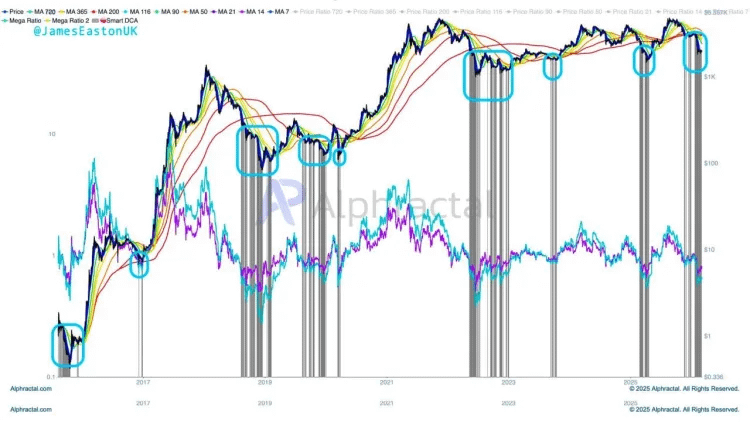 Przechodzimy od razu do rzeczy, ponieważ wiem, że uważnie śledzisz, jak porusza się twoja inwestycja. Okazuje się, że wskaźnik "Smart DCA" (który zasadniczo pomaga nam zrozumieć, kiedy jest idealny moment, aby stopniowo gromadzić bez paniki) ponownie się aktywował. Dlaczego to jest ważne? Ponieważ za każdym razem, gdy ten wskaźnik dawał znać w przeszłości, pokrywał się z tymi momentami, w których ceny były w pełnej strefie akumulacji, tuż przed tym, jak rynek zrobił interesujący skok. Zasadniczo, wykresy długoterminowe, z wszystkimi tymi średnimi kroczącymi analizowanymi przez ekspertów jak James Easton, pokazują wzorce, które już wcześniej widzieliśmy, gdy rynek przygotowuje się do wyjścia z korekty i wejścia w tryb odbicia. 📈