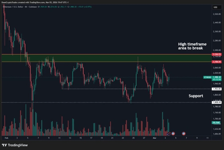 Ahora mismo, el gran jefe a vencer es la resistencia de los $2.100. Hemos visto cómo el precio intenta tocar esa puerta varias veces, pero todavía no logra cerrarse por encima. Por otro lado, tenemos un suelo de seguridad muy claro cerca de los $1.800, que es donde el precio rebotó con fuerza tras la última caída. Estamos atrapados en un rango, pero con una presión alcista que se siente en el aire. La estrategia aquí está clara: el mercado está probando la resistencia, acumulando fuerza y esperando el momento justo para romper. ⛓️💎