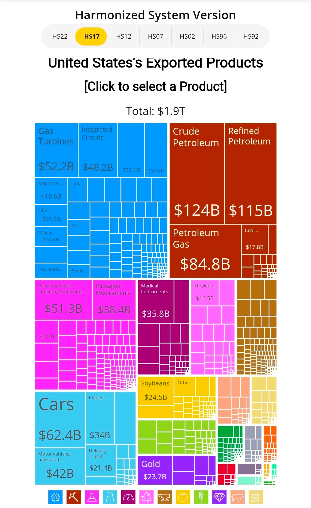 The United States maintains a diversified export portfolio, led by energy products, high-tech machinery, pharmaceuticals, and vehicles. This mix reflects both natural resource strength and advanced industrial capability in the global market.