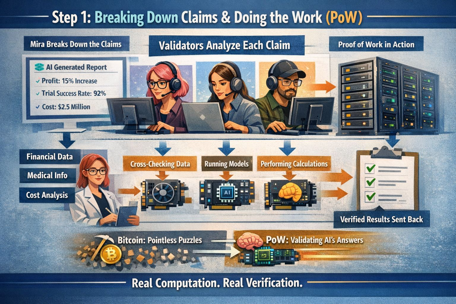 Mira flips the script. It turns every AI output into a claim then sends those claims to a network of independent validators. To keep everyone honest, Mira uses a mix of PoW and PoSso validators have to put in both real computing work and real money.