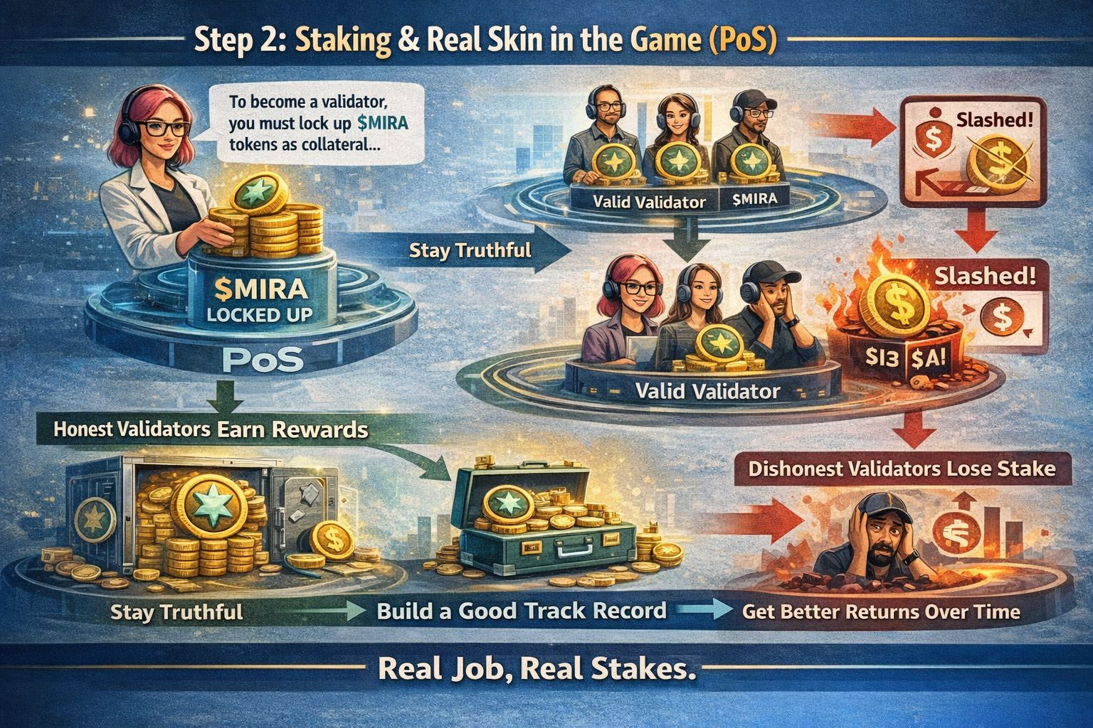 To even join as a validator, you have to lock up $MIRA tokens as collateral. If you mess up submit wrong or malicious results, or just try to game the system the network can slash your stake.