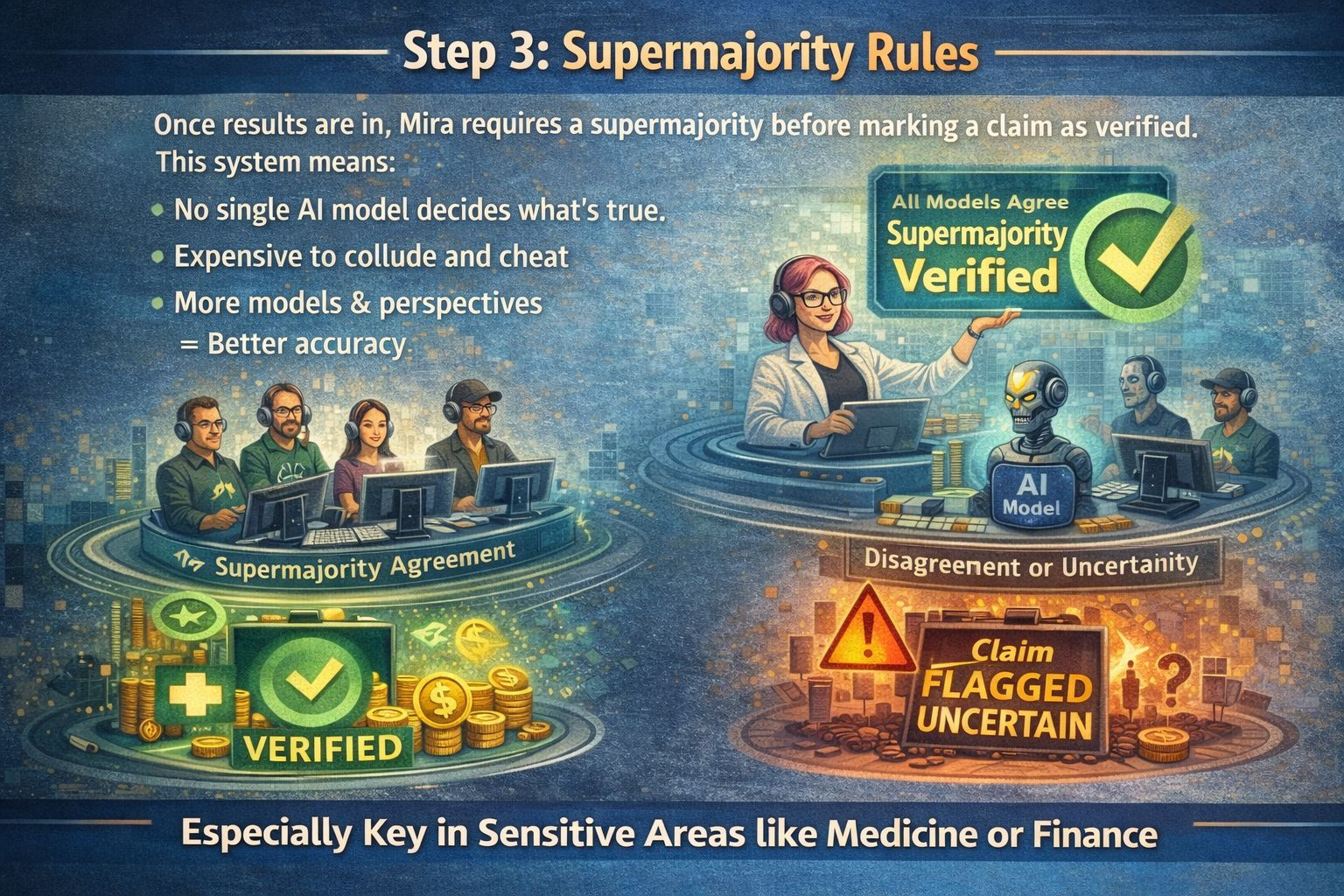 Once everyone’s submitted their results, Mira doesn’t just go with the majority it needs a supermajority before marking a claim as verified.