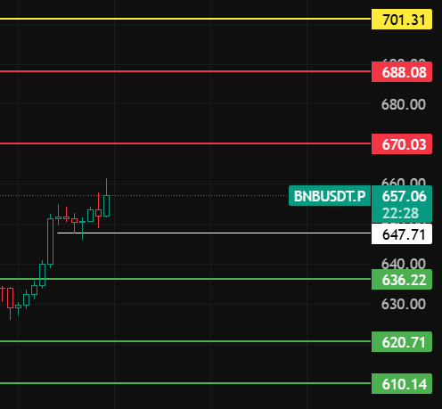BNB nocą zwróć uwagę na to miejsce 647, dopóki nie przebijesz tego miejsca przy korekcie, trend wzrostowy nadal będzie trwał, kontynuuj wzrost, zwróć uwagę na poziomy oporu 670-688-701 w pobliżu tych miejsc!
