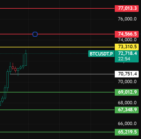 Duża moneta nocą zwróć uwagę na to miejsce 70750, dopóki nie przebijesz tego miejsca przy korekcie, trend wzrostowy nadal będzie trwał, kontynuuj wzrost, zwróć uwagę na poziomy oporu 73310-74570-77000 w pobliżu tych miejsc!