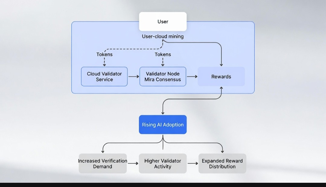 When discussing Mira Network, it is important to understand what cloud mining really means within its ecosystem. Mira is not a traditional Bitcoin style mining chain. It operates through AI verification and validator staking. So cloud participation here is about contributing to verification power rather than brute force computation.