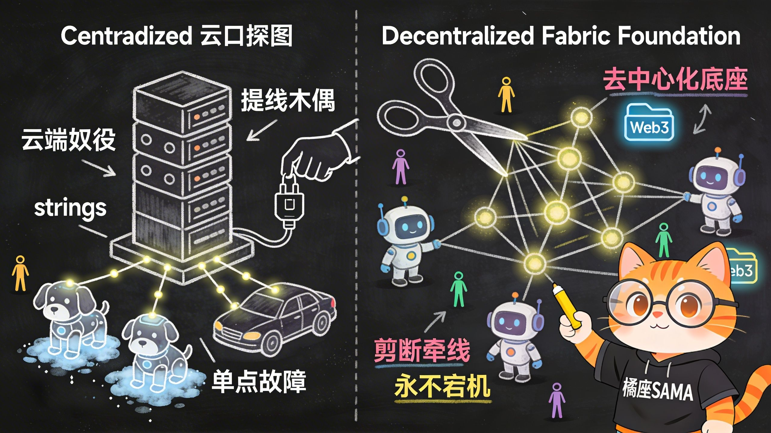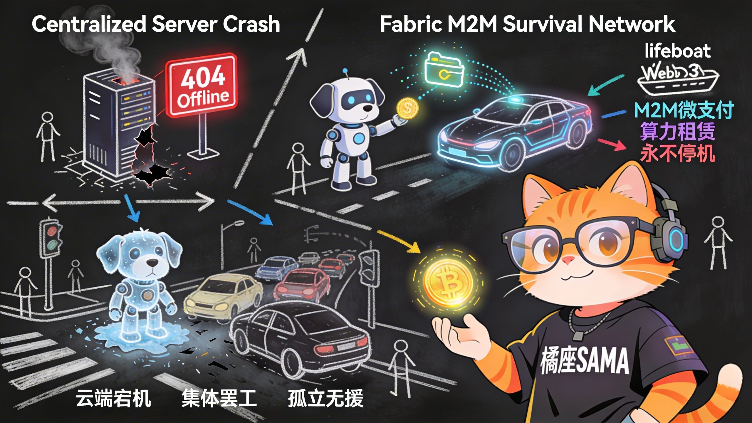 在这个网络里,哪怕硬件厂家倒闭了,哪怕云端断网了,只要去中心化的 Fabric 节点还在全球各地运行,你的机器人就能继续干活、继续收钱。